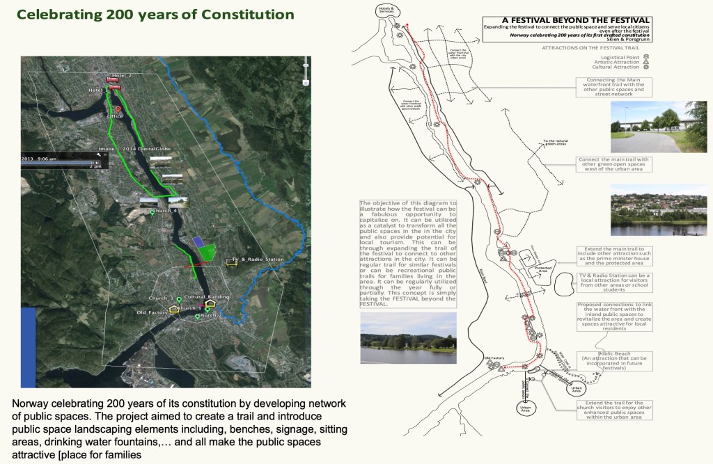 Norway celebrated 200 years of its constitution by developing a network of public spaces. The project aimed to create a trail and introduce public space landscaping elements including, benches, signage, sitting areas, drinking water fountains, and make the public spaces an attractive place for families.
